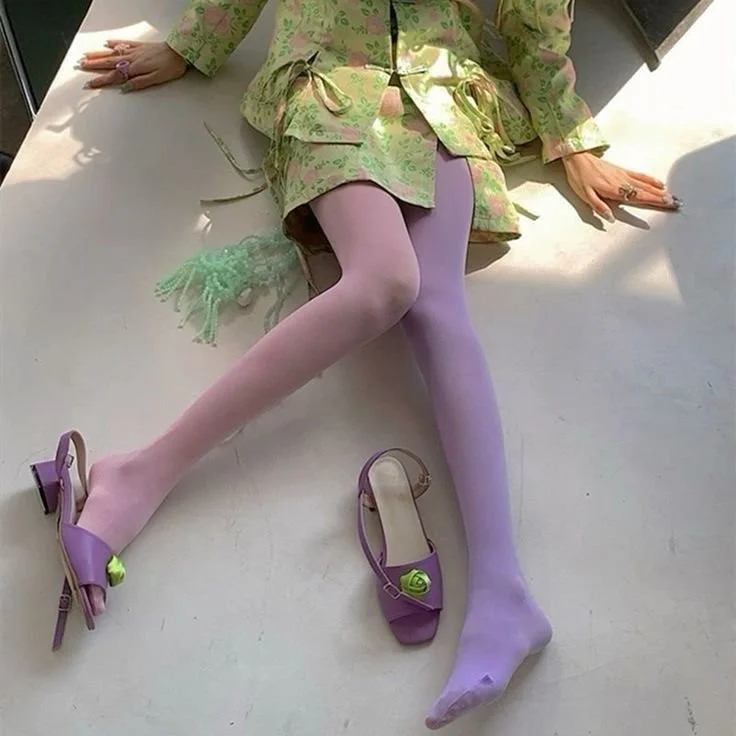 Colored tights, bras, leotards, with solid color backdrops and funky poses that exaggerate length and shape